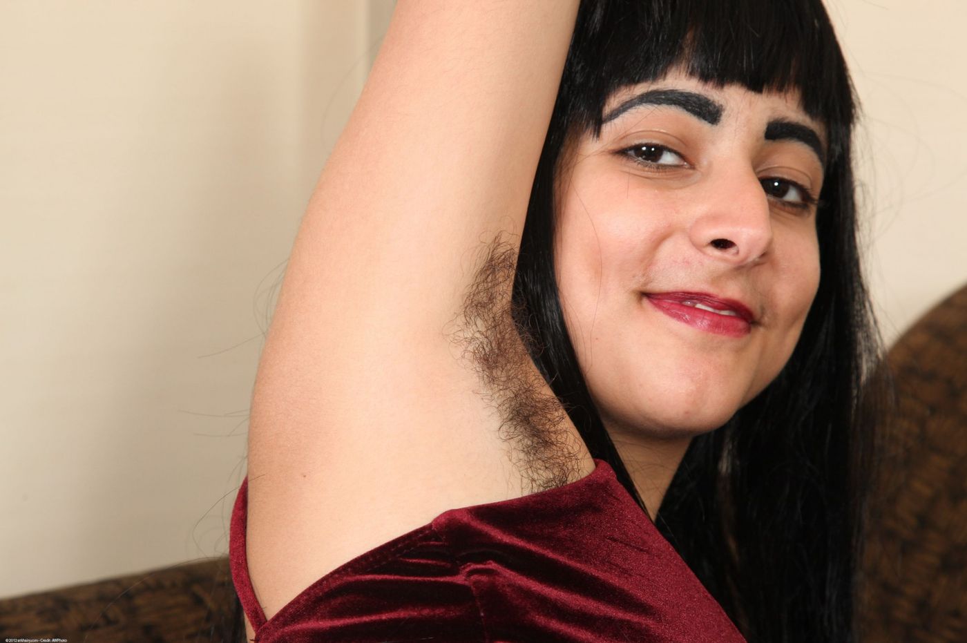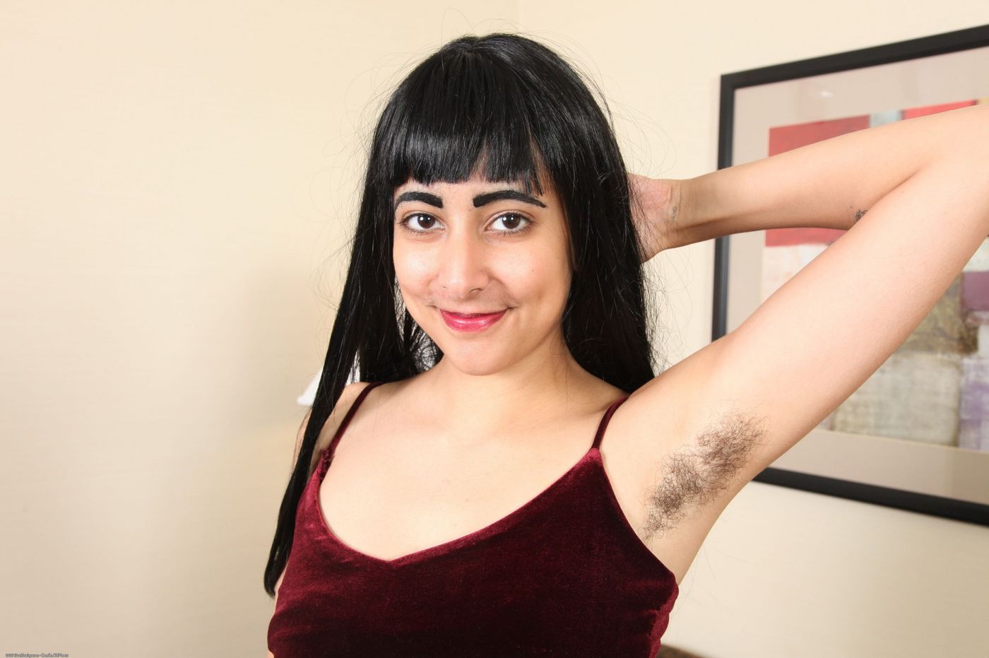- Description: Eris Vespera masturbates her hairy snatch on the couch, exposing her hairy armpits.