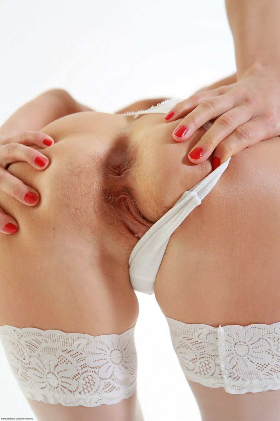 - Description: Hairy blonde Lera comes out from behind the curtain, wearing white lingerie. She takes the lingerie off, still covered by a shear curtain, she fingers her pussy and then sticks a still into her moist hairy blonde pussy.
